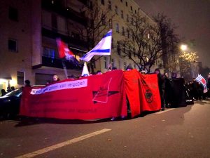 In Berlin gab es weitere Demonstrationen und Veranstaltungen zu den Novemberpogromen. So veranstaltete die Antifa Oranienburg eine Demonstration in Berlin-Orianenburg und in der Hufeisensiedlung in Britz wurde gegen die dortige Naziterrorserie und für die in den letzten Tagen gestohlenen Stolpersteine demonstriert. Der antisemitische BDS, der leider in einige linke Spektren anschlussfähig ist, hatte ab 15 Uhr am Potsdamer Platz eine Veranstaltung zur Delegitimierung Israels angemeldet. Am Jahrestag der Novemberpogrome. Unter dem Aufhänger des Mauerfalls wurde hier antisemitische Agitation versucht. Mehr als 20 Personen fanden sich aber nicht ein und es gab kaum Außenwirkung.