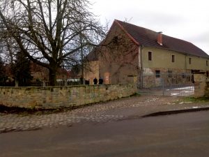 In Schnellroda selber gibt es fünf interessante Punkte. Einmal den Sammel-, Demostart- und Endpunkt sowie die zwei Standorte, an denen Infostände über das IfS und co aufklären. Dann das Gehöft von Kubitschek (auf dem groß Antaios steht) und die Gaststätte „Zum Schäfchen“, in dem die Winterakademie stattfindet. Am Sammelpunkt laufen einem Lothar und Katharina König über den Weg, Antifa bleibt eben Lamdarbeit. An den beiden Infopunkten hängen ein paar Transpis und es gibt Infobroschüren mit Rechercheartikeln aus den letzten beiden Jahren. Viel Aufmerksamkeit bekommen diese aber nicht. Es ist anzunehmen, dass inzwischen eh alle im Dorf wissen, wer ihr Nachbar ist. Aufmerksamkeit erregen sie trotzdem, fahren doch etliche Autos vorbei. Spätestens jetzt weiß man im Dorf, dass wieder einmal eine Schulung stattfindet. Es haben sich wohl schon Anwohner*innen solidarisch mit den Protesten geäußert und gegen Kubitschek positioniert. Es ist allerdings verständlich, wenn man in einem so kleinen Ort darauf verzichtet dies zu öffentlich zu tun, vor allem wenn sich die Person der Ablehnung regelmäßig Schläger wie Mario Müller einlädt.
