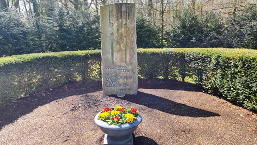 Nur wenige Meter entfernt vom Denkmal am Busdorfwall steht ein weiteres, direkt am Parkplatz des Ostfriedhofs Paderborn. Dieses quaderförmige Ehrenmal hat wie auf den Fotos 2 und 3  der Fotogalerie zu sehen auf allen vier Seiten Inschriften. Straßenseitig steht „Die Paderborner Panzer-Regimenter R11 A65 R27„, zur Friedhof gewandten Seite ist wiederum „Unseren Kameraden 1939 – 1945“ und darunter ein eisernes Kreuz zu sehen. An den kurzen Seiten werden „Panzer-Regiment II, Panzer-Abteilung 65 1939 Polen, 1940 Frankreich, 1941 – 1945 Ostfeldzug“ und „Panzer-Regiment 27 1941-1945 Ostfeldzug“ aufgeführt. Das Ehrenmal ehrt also auch Panzer-Regimentern Nazideutschlands im Zweiten Weltkrieg. Es wird sogar explizit erwähnt, dass diese am sogenannten „Ostfeldzug“ beteiligt waren, also dem Angriff Nazideutschlands auf die Sowjetunion, bei dem die Wehrmacht mehrere zehn Millionen Einwohner*innen der Sowjetunion ermordete.