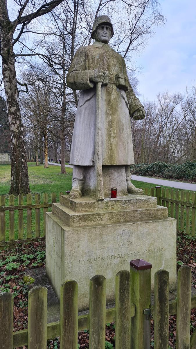 Das von der Stadt am stärksten in eigene Veranstaltungen eingebundene Denkmal ist das in Foto 1 in der Fotogalerie zu sehende Ehrenmal am Busdorfwall. Es wurde 1953 nach einem Entwurf des Paderborner Künstlers Josef Rikus gebaut und sollte als „Ehrenmal für all die Gefallenen und Toten der Stadt Paderborn, Soldaten wie Zivilisten, Männer wie Frauen“ dienen [1]. Diesem schon von der Zielrichtung einseitigen Zweck ist man mit der Inschrift „Uns mahnen 827 Opfer des Bombenkrieges 1940 – 1945 | Die Gefallenen unserer Stadt und der Paderborner Regimenter 1914 – 1918 + 1939 – 1945“ auch vollends gerecht geworden. In der ersten Hälfte der Inschrift wird salopp von einem „Bombenkrieg“ gesprochen, dem ab dem Jahr 1940 Paderborner*Innen zum Opfer fielen. Damit wird nicht nur nicht verschwiegen, dass Nazideutschland den Krieg ein Jahr zuvor begann, um eigenes Territorium auszuweiten und später Millionen von Menschen in Osteuropa industriell organisiert zu ermorden und dass diese Bomben von jenen kamen, die sich gegen die Angriffe Deutschlands verteidigen mussten. Der Krieg wird auf diese Weise auch zu einem Krieg unter vielen gemacht, bei dem man nur der eigenen Opfer gedenkt. In der Zweiten Hälfte der Inschrift wird außerdem auch explizit deutscher Regimenter im Zweiten Weltkrieg gedacht, also Wehrmachtsoldaten, die den Krieg im Namen Nazideutschlands führten.