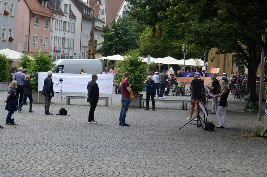 Aus diesen und anderen Videos hervor geht auch die lautstarke Gegendemonstration, die sich unter anderem nach einer angemeldeteten Kundgebung am Hans und Sophie Scholl Platz zum Marktplatz und der AfD Kundgebung bewegte. Daran nahmen mehr als doppelt so viele Personen teil. Die Angaben linker Gruppen schwanken zwischen 60 und 100 Personen.