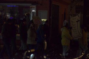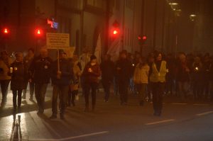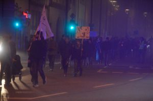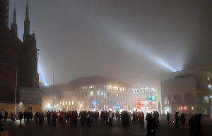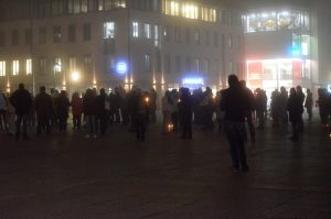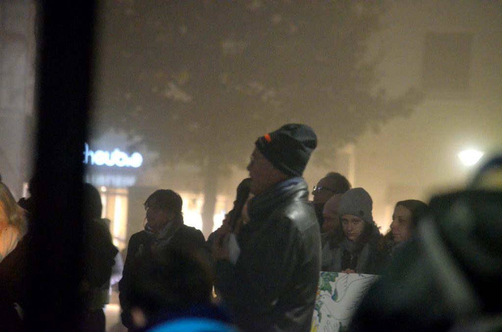 Passant:innen reagierten teilweise mit Irritation und Widerspruch auf das Geschehen am Münsterplatz und der späteren Laufdemonstration mit rund 150 Teilnehmern, die zum Teil mit Kerzen im Nebel Aufmerksamkeit erregten.