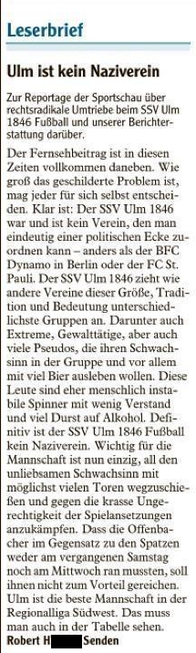 Ein Bericht in der Sportschau über Nazis in westdeutschen Fußballvereinen hat in Ulm für einiges an Aufsehen gesorgt, da der SSV als eines von drei Beispielen genannt wird. Von Vereinsvorstand, Unterstützer, Oberbürgermeister bis zu einzelnen Hooligans gibt es eine Vielzahl an Reaktionen und Berichten. Hier ein Überblick zum Pressespiegel, Presseanfragen, unsere Einschätzung und einem Leserbrief eines Hooligans.