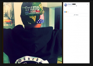 - In den sozialen Medien konnten wir mehrere bereits 2019 Posts und Bilder mit extrem rechten Inhalten von ihm finden. So positionierte er sich pro Donald Trump, ihm gefiellen mehrer AfD Seiten und er teilte Musik der extrem rechten Gruppe „Gigi und die braunen Stadtmusikanten„. Letzteres ist ein Musikprojekt von Daniel Geise, der Sänger in der neonazistischen Band Stahlgewitter ist und verurteilt wurde da ein Song von ihm eine Anspielung und Zelebrierung der Morde des NSU darstellen.