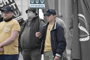 Arthur und Alex beteiligen sich mit mindestens zwei anderen NSP Stuttgart Mitgliedern an den Aufmärschen der Kleinstpartei in Gera am 26.03.22 und Erfurt am 01.05.22. Alle Personen, die beim Aufmarsch in Gera anwesend waren sind Polizeibekannt. Denn dieser Aufmarsch wurde wegen uniformierten Auftreten von der Polizei aufgelöst und alle 81 anwesenden Nazis wurden Erkennungsdienstlich behandelt. Das trifft auf drei Mitglieder der NSP Stuttgart, darunter Arthur und eine Person die sich „Simon“ nennt zu.