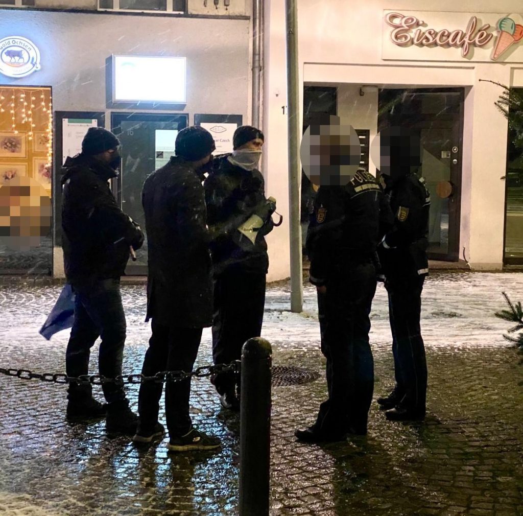 Einige der Teilnehmenden der Kundgebung antworten direkt mit „Nazis raus“ und „Halt die Fresse“-Parolen. Nach ca. 20 Minuten kam die Polizei und kontrollierte die drei Personen. Dabei wurden wahrscheinlich die Personalien kontrolliert. Gegenüber den Kundgebungsteilnehmer:innen sollen Polizeikräfte geäußert haben, die drei Personen haben ihr Verhalten damit begründet, dass ihre eigenen Kundgebungen ständigem Gegenprotest ausgesetzt seien.