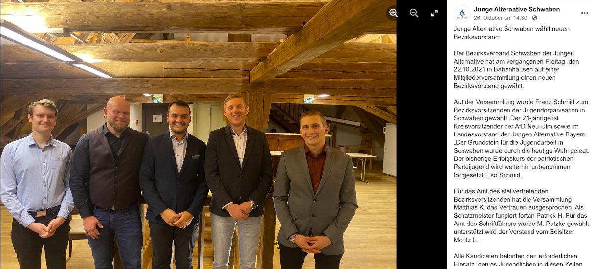 Unseren bisherigen Erkenntnissen nach, waren darunter zum einen ein aktives Mitglied der Identitären Bewegung Schwaben und der Schriftführer der Jungen Alternativen Schwaben beteiligt.