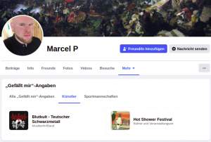 Anmerkung: Die Likes der Band Blutkult und des Hotshower Festivals sind mittlerweile nicht mehr aufrufbar auf dem Facebook Profil von Marcel Patzke