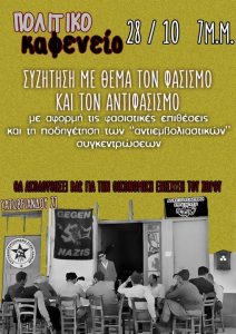 Την Πέμπτη 28/10 θα πραγματοποιηθεί πολιτικό καφενείο στις 19.00 από την αντιεξουσιαστική συνέλευση Resisto. Συζήτηση σχετική με τον φασισμό και τον αντιφασισμό.