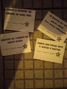 Σα μια πρώτη αντίδραση στα προαναφερθέντα περιστατικά,το βράδυ της Κυριακής,4/7,πραγματοποιήσαμε μηχανοκίνητη παρέμβαση με χιλιάδες αντισεξιστικά τρικάκια στους δρόμους της Λαμίας,με ιδιαίτερη έμφαση στα σημεία όπου σημειώθηκαν οι σεξουαλικές παρενοχλήσεις.