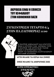 Καλούμε σε συγκέντρωση την Τετάρτη 6/4 στις 11:00 στην πλατεία Ελευθερίας.