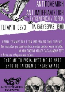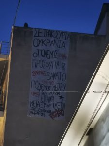 Το απόγευμα της Πέμπτης,24/3,αναρτήθηκε γιγαντοπανό στο κέντρο της πόλης,απέναντι από τη λέσχη αξιωματικών Λαμίας.Το πανό αφορά την εναντίωση μας στους διακρατικούς πολέμους αλλά και το διαχωρισμό των προσφύγων,από το κράτος και τα συντηρητικά κομμάτια της κοινωνίας, σε ευπρόσδεκτους και μη.Οι πρόσφυγες και οι μετανάστριες,από όποιο μέρος του κόσμου κι αν προέρχονται,είναι οι κυνηγημένοι από τους πολέμους και απ’ την εξαθλίωση που επιβάλλουν τα κράτη και το κεφάλαιο.Στην προσπάθεια του το κεφάλαιο να επεκτείνει την κυριαρχία του και να πολλαπλασιάσει τα κέρδη,δημιουργεί στρατιές εξαθλιωμένων ανθρώπων που το μόνο που αναζητούν είναι ένα ασφαλές καταφύγιο.Γι’αυτούς τους λόγους στεκόμαστε απέναντι σε οποιοδήποτε πόλεμο εξαπολύουν οι ισχυροί του κόσμου με θύματα,άτομα κυρίως της δικής μας τάξης και προφανώς είμαστε αλληλέγγυα με όλους τους μετανάστες και τους πρόσφυγες,ανεξαρτήτως της θρησκείας και του χρώματος τους.Στον αντίποδα προτάσσουμε τον ταξικό πόλεμο,τον πόλεμο που μπορεί να μας επιστρέψει ότι μας έχει κλαπεί απ’ τα κάθε λογής αφεντικά και απ’ την εξουσία γενικότερα.ΣΕ ΙΡΑΚ,ΣΥΡΙΑ,ΟΥΚΡΑΝΙΑ,Ο ΠΟΛΕΜΟΣ ΓΕΝΝΑ ΠΡΟΣΦΥΓΙΑ ΚΑΙ ΣΠΕΡΝΕΙ ΘΑΝΑΤΟ.ΚΑΝΕΝΑΣ ΠΟΛΕΜΟΣ ΜΕΤΑΞΥ ΤΩΝ ΛΑΩΝ,ΚΑΜΙΑ ΕΙΡΗΝΗ ΜΕΤΑΞΥ ΤΩΝ ΤΑΞΕΩΝ