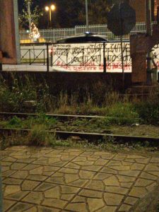 Κατά τη διάρκεια της τοποθέτησης του πανό, περιπολικά πέρασαν απ’ το σημείο, αφού στην ασυνήθιστα μπατσοκρατούμενη πόλη μας, είναι σύνηθες να βλέπουμε περισσότερα τέτοια να κυκλοφορούν τις βραδινές και μεταμεσονύχτιες ώρες απ’ ότι συμβατικά οχήματα. Μετά από λίγα λεπτά, κάνουν την εμφάνισή τους συντεταγμένα 3 περιπολικά, οι μπάτσοι περικυκλώνουν τους δύο συντρόφους που βρίσκονταν στο σημείο και τους υποβάλλουν σε εξακρίβωση στοιχείων. Η αστυνομική δύναμη ενισχύθηκε από 2 ακόμα περιπολικά και ένα ασφαλίτικο, αφού κρίθηκε πως είναι αρκετά επικίνδυνο να τοποθετείς πανό. Οι μπάτσοι προχώρησαν στο συνηθισμένο “καψόνι” που έχουμε ξαναδεί και παλιότερα στην πόλη,αυτό της ατελείωτης αναμονής και ενώ είχαν δωθεί τα απαραίτητα στοιχεία απ’ τους συντρόφους, με τη δικαιολογία ότι “περιμένουμε να μας πουν τι θα σας κάνουμε”. Η αναμονή συνεχίστηκε, εν μέσω τραμπουκισμών και φωνών από τους μπάτσους, λέγοντας πως άμα εμείς θέλουμε να έρθετε στο τμήμα,θα έρθετε. Η τρομερή αυτή επιχείρηση τελείωσε λέγοντας στους συντρόφους να κατεβάσουν το πανό για να τους αφήσουν να φύγουν (!) αλλιώς θα κάτσουμε όλο το βράδυ εκεί. Όταν οι σύντροφοι είπαν πως αυτό είναι παράλογο και έκαναν ξεκάθαρο πως το πανό δεν κατεβαίνει, μπήκαν στα περιπολικά και έφυγαν.