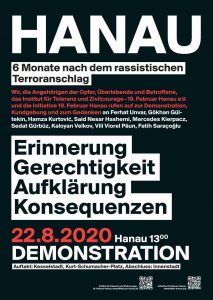 Am 19. Februar 2020 wurden in Hanau neun Menschen aus rassistischen Motiven ermordet. Ferhat Unvar, Gökhan Gültekin, Hamza Kurtović, Said Nesar Hashemi, Mercedes Kierpacz, Sedat Gürbüz, Kaloyan Velkov, Vili Viorel Păun und Fatih Saraçoğlu starben durch die Hand eines Rassisten. Sechs Monate danach sollte am 22. August 2020 eine große Gedenkveranstaltung an die Opfer erinnern. Damit wollten die Angehörigen, die Überlebenden und Betroffenen zusammen mit Unterstützer*innen ihre Forderungen nach „Erinnerung, Gerechtigkeit, Aufklärung und Konsequenzen“ auf die Straße tragen. Wegen des Verbots der Großveranstaltung, fanden in rund 30 Städten dezentrale Gedenkkundgebungen statt.