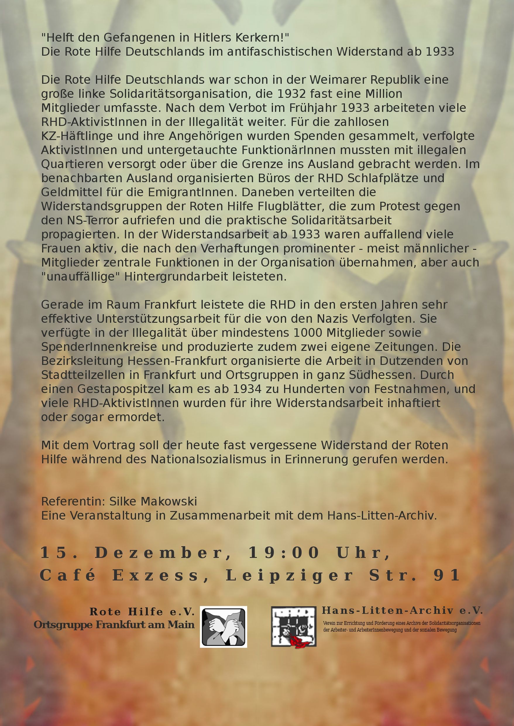 Die Ortsgruppe Frankfurt der Roten Hilfe lädt am Dienstag, 15. Dezember 2015 um 19:00 Uhr ins Café Exzess zum Vortrag ein: