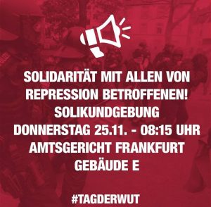 Kommt zu den Prozessen im Februar am Amtsgericht Frankfurt: Lasst die Betroffenen nicht allein, sondern stellt euch an ihre Seite. Seid da und bringt Genoss*innen mit. Unsere Solidarität gegen ihre Repression!
