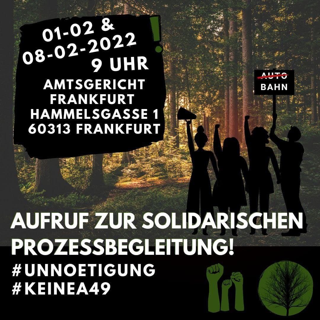 Um auf die Klimakatastrophe aufmerksam zu machen und ein deutliches Zeichen gegen den Ausbau der #KeineA49 und der damit verbundenen Rodung des Dannenröder Forsts zu setzen, entrollten zahlreiche Klimaaktivisti Transparente an etlichen Autobahnbrücken. Fünf von ihnen sind nun angeklagt. Kommt zum Prozess nach Frankfurt! Zeigt euch solidarisch und lasst uns gemeinsam klar stellen, dass Klimaschützen kein Verbrechen ist!“