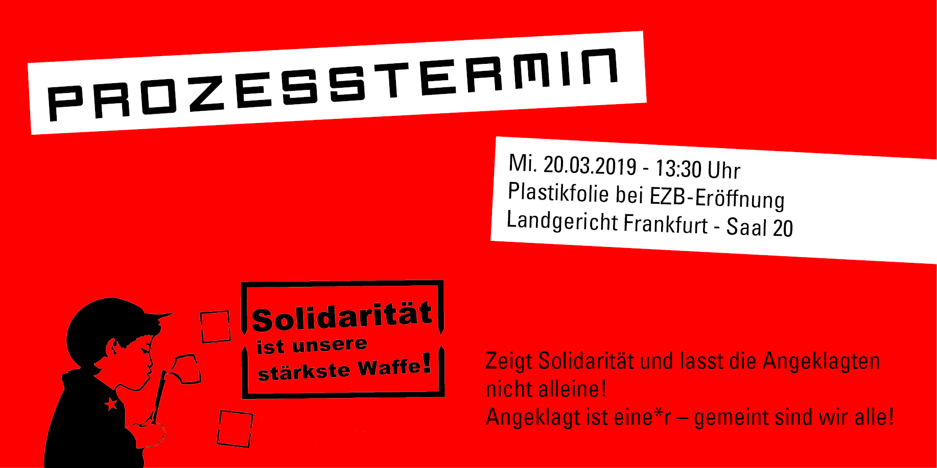 Zeigt Solidarität und kommt am Montag 13. Januar 2020 um 14:00 Uhr zum Amtsgericht Frankfurt, Hammelsgasse 1, Gebäude E, Saal 23, 2. OG und lasst die Angeklagten nicht alleine! Angeklagt ist einer – gemeint sind wir alle!
