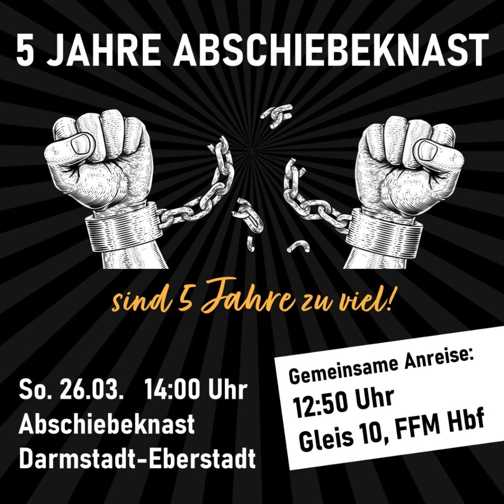 Zwar findet das nicht mehr im Rahmen des Tags der politischen Gefangenen statt, passt aber thematisch sehr: Am Wochenende drauf geht es zum Abschiebeknast in Darmstadt-Eberstadt, der ärgerlicherweise schon seit 5 Jahren dort steht. Am Samstag (25.3.) gibt es ab 10 Uhr Workshops und abends Konzert. Am Sonntag (26.3.) geht’s dann gemeinsam Richtung Gefängnis. Alle Infos dazu gibt es hier.