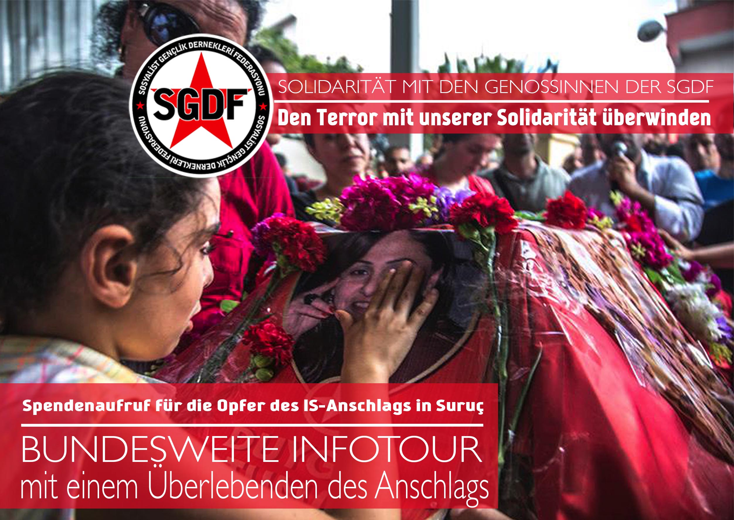 Wir wollen die Opfer des Anschlags in Suruç nicht allein lassen und rufen zur aktiven Solidarität mit den Verletzten und den Hinterbliebenen der getöteten GenossInnen auf. Unsere Absicht ist es außerdem zu verhindern, dass der Terror des IS und des AKP-Regimes Solidaritätsprojekte der linken Bewegung in der Türkei mit den Menschen in Kobanê unterbindet.