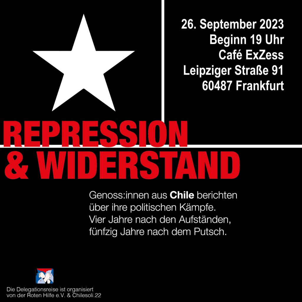 Was hat das neoliberale Labor der Militärdiktatur von 1973 mit dem Aufstand von 2019 und dem Verfassungsreferendum von 2022 zu tun? Welche Relevanz hat diese Geschichte für Kämpfe in Deutschland? Welcher Repression sind die Genoss*innen ausgesetzt und wie organisieren sie ihren Widerstand? Um diese Fragen zu diskutieren und in einen gemeinsamen Austausch zu kommen, sind Aktivist:innen aus verschiedenen Strömungen und Spektren eingeladen, die von der historischen wie aktuellen Repression, aber auch aus dem Inneren der feministischen und der Schüler*innen-Bewegung berichten werden.