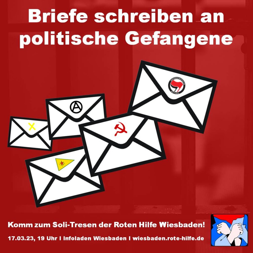 Am Freitag, den 17.03. um 19 Uhr lädt die Rote Hilfe Wiesbaden ein, in den Infoladen, Blücherstraße 46 (Hinterhof), zum Solitresen und gemeinsamen Briefe schreiben für Gefangene.