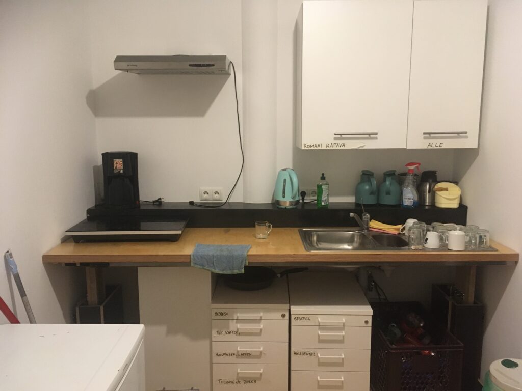 – Teeküche mit Kühlschrank, höhenverstellbarer Arbeitsplatte, Wasserkocher, Kaffeemaschine, Kochplatte