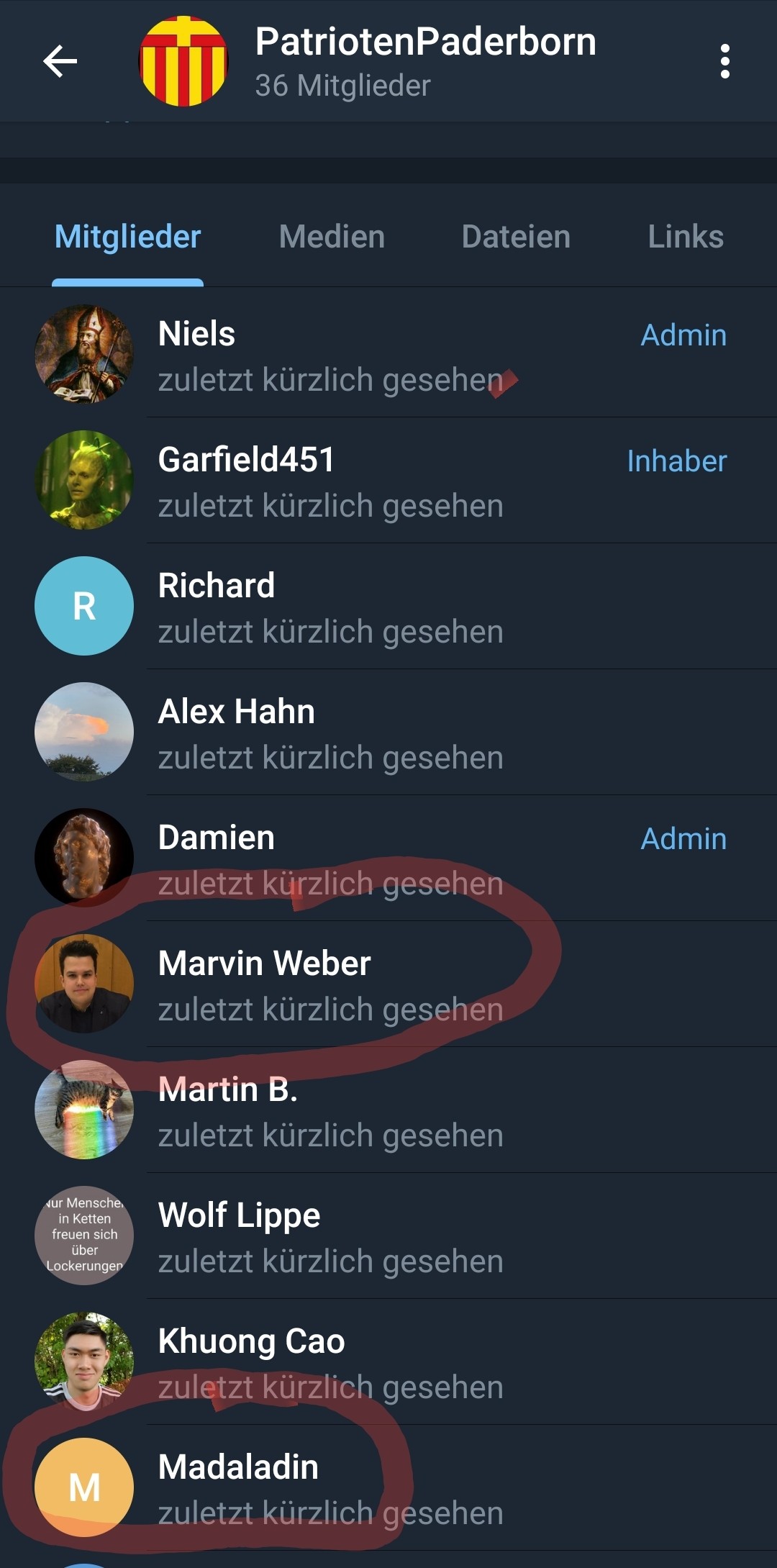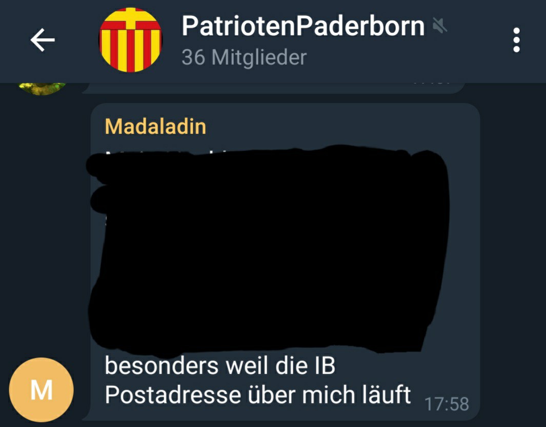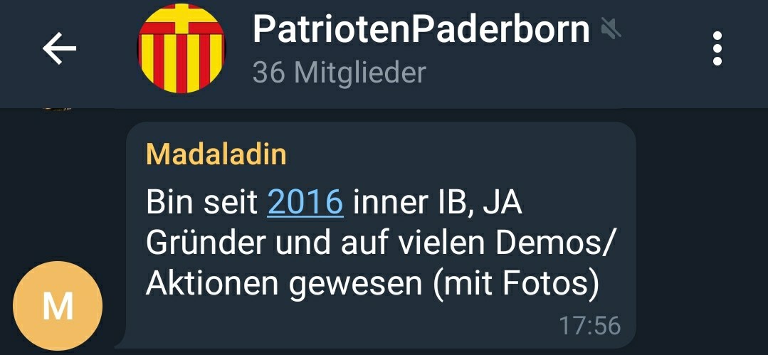 Außerdem ist Küsterarend unter dem Pseudonym „Madaladin“ Mitglied der Telegram-Gruppe „Patrioten Paderborn“. Hier werden verschiedene menschenfeindliche Inhalte geteilt und sich lokal vernetzt. Küsterarend gab in der Gruppe u.a. auch offen zu, dass er Mitglied der extrem Rechten Identitären Bewegung ist. Neben ihm ist in der Gruppe ebenfalls der Bürgermeisterkandidat der AfD Marvin Weber.