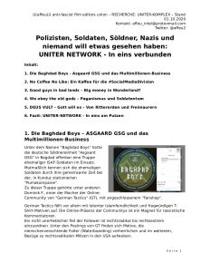 Uncategorized Polizisten, Soldaten, Söldner, Nazis und niemand will etwas gesehen haben: UNITER NETWORK – In eins verbunden 6. Oktober 2020 rkowl Folgende ausführliche Recherche (Asgaard / Uniter – Komplex) wurde uns zur Veröffentlichung auf unserem Blog von „(((affeu))) anti-fascist film editors union“ zur Verfügung gestellt. Ihr findet die Recherche untenstehend als PDF.