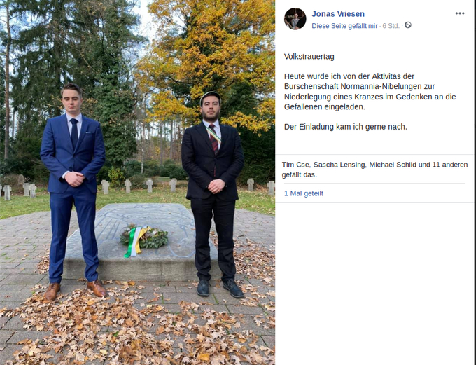 Die JA Arnsberg wird von dem rechten Burschenschafter Nils Hartwig geführt, der 2016 maßgeblich für die Gründung der IB NRW verantwortlich wariii. Hartwig ist Teil der völkisch-nationalistischen Burschenschaft Normannia Nibelungen in Bielefeld, arbeitet für die AfD im Landtag NRW und ist Beisitzer im Vorstand der JA NRW (wie auch Maximilian Kneller aus Bielefeld). Hartwig und Lehmann kennen sich schon aus IB-Tagen, so nahmen beide bspw. am 21.12.2016 an einer Blockade-Aktion der IB vor der CDU Zentrale teiliv. Auch Jonas Vriesen pflegt gute Kontakte zur Normannia Nibelungen. Ein Aktiva der Normannia Nibelungen nahm am 01.11.2020 am JA-Stammtisch teil, zwei Wochen später nahm Vriesen an der Volkstrauertag-Aktion der Normannia Nibelungen teil.