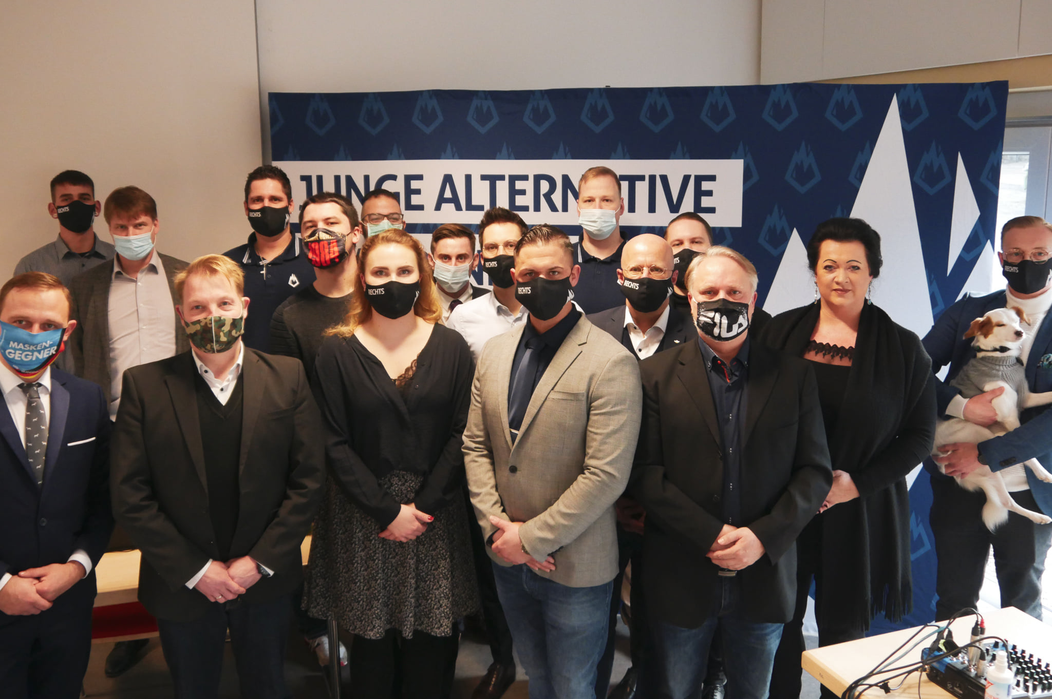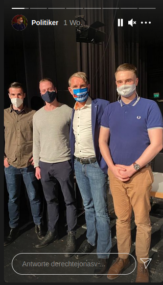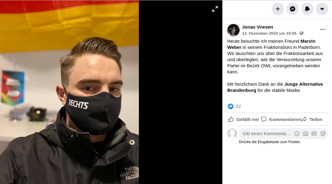 aufgrund seiner Mitgliedschaft in der verbotenen „Heimattreuen Deutschen Jugend“ wird Kalbitz weiter als Redner geladen, posiert für Fotos und trägt selbstverständlich auch die von Hannes Gnauck beworbene Maske der JA Brandenburg. Wie nun auch Jonas Vriesen in Bielefeld.