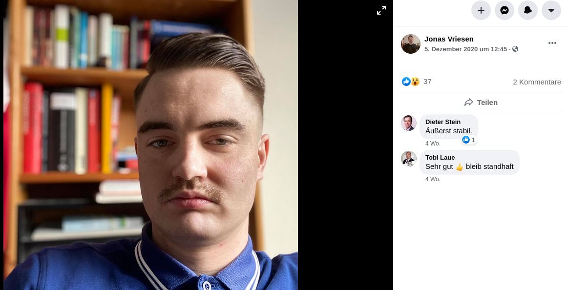 Insgesamt scheut Jonas Vriesen keine Kontakte ins extrem rechte burschenschaftliche Milieu, sondern fühlt sich dort wohl und nutzt die Seilschaften der völkisch-nationalistischen Männerbünde. Im Sommer 2020 absolvierte Vriesen ein Praktikum bei der rechtskonservativen Berliner Wochenzeitung „Junge Freiheit“ (JF). Die JF kann der Neuen Rechten zugeordnet werden, mit ihren nationalistischen, rassistischen und mithin völkischen und geschichtsrevisionistischen Publikationen erfüllt die JF eine Scharnierfunktion innerhalb der rechten Medienlandschaft zwischen nationalkonservativem und extrem rechten Spekrtum. Die JF fungiert als Flaggschiff des neurechten Kampfes um kulturelle Vorherrschaftv. JF-Chefredakteur Dieter Stein gilt als parteilos, steht aber auf der Fördererliste der AfDvi. Auf facebook gefällt Dieter Stein Jonas Vriesens neuer Schnurrbart.