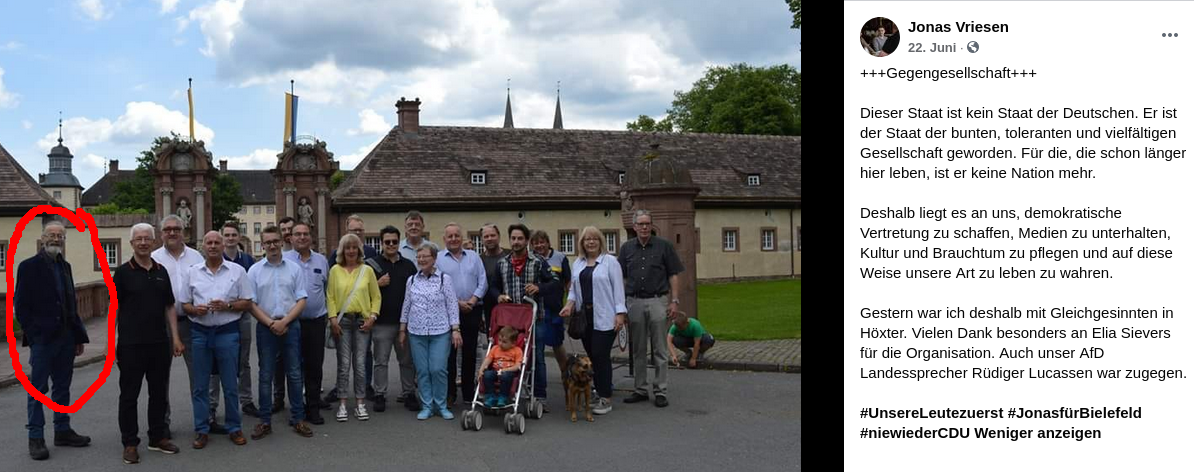 „Dieser Staat ist kein Staat der Deutschen. Er ist ein Staat der bunten, toleranten und vielfältigen Gesellschaft geworden. Für die, die schon länger hier leben, ist er keine Nation mehr. Deshalb liegt es an uns, demokratische Vertretung zu schaffen, Medien zu unterhalten, Kultur und Brauchtum zu pflegen und auf diese Weise unsere Art zu leben zu wahren. Gestern war ich deshalb mit Gleichgesinnten in Höxter.“