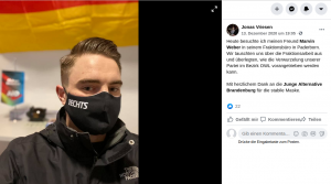 Mitte Dezember tauschte Vriesen seine IfS-Maske dann gegen eine Maske der JA Brandenburg aus. Spitzenkandidat der JA Brandenburg für die kommendes Bundestagstagswahl ist der Oberfeldwebel Hannes Gnauck. Der MAD stuft Hannes Gnauck als „Fall mit fehlender Verfassungstreue“ ein, die gesamte JA Brandenburg wird vom Verfassungsschutz als „rechtsextremer Verdachtsfall“ beobachtetxii. Die JA Brandenburg ist eng mit Andreas Kalbitz verwoben. Auch nach dem Parteiausschlussverfahren von Kalbitz