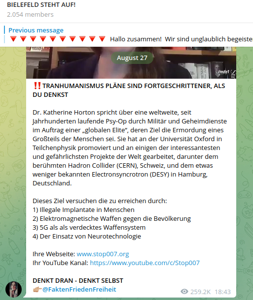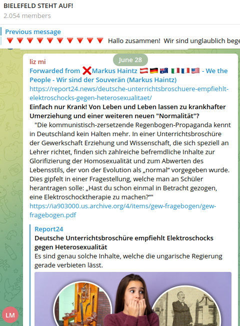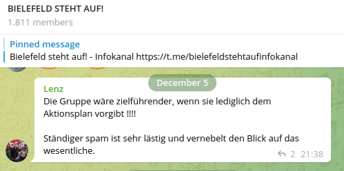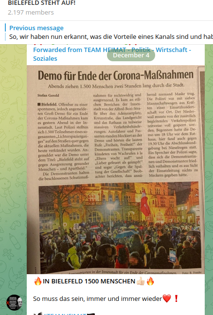 Die erste Berichterstattung zu der verschwörungsideologischen Demo am 03.12.21 war überwiegend positiv für die Organisator*innen und Teilnehmer*innen von „Bielefeld steht auf“. Obwohl die Presse normalerweise in dieser Szene als Lügen- oder Mainstreampresse verschrien ist, ließen sich die Artikel der Neuen Westfälischen und des WDR wunderbar für verschwörungsideologische Propaganda nutzen. Die Chat-Gruppe ist in nur einer Woche auf über 2000 Mitglieder angewachsen, für die nächste Demo am 17.12.21 auf dem Kesselbrink in Bielefeld wird in allen einschlägigen Kanälen und auch nordrheinwestfälischen Neonazi-Kanälen (z.B. Die Rechte Dortmund) via Telegram mobilisiert.