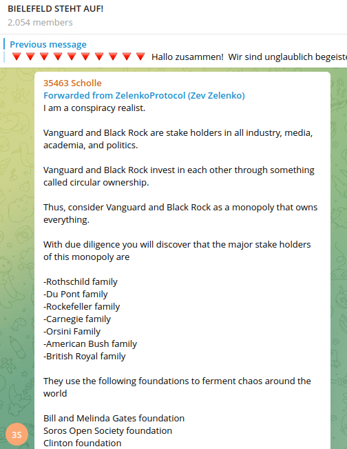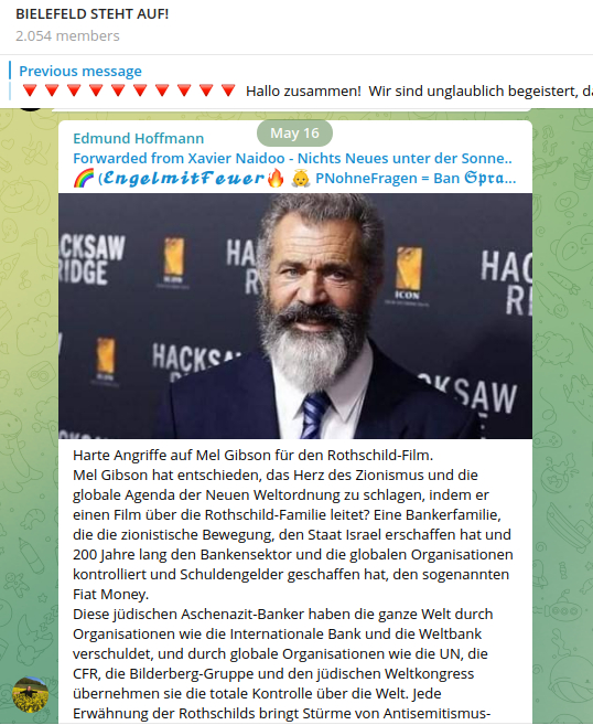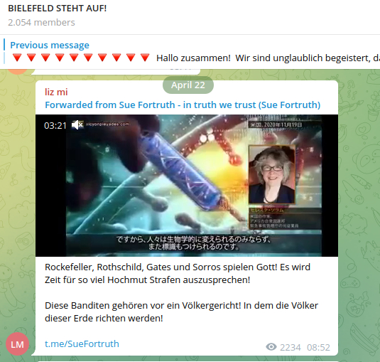Wie wir schon in unserer ersten Stellungnahme zu „Bielefeld steht auf“ Anfang April 2021 klar dargelegt haben, dominieren in den Telegram-Chats strukturell bis offen antisemitische Verschwörungsmythen. So wird von der jüdischen Familie Rothschild schwadroniert, diese Familie sei verantwortlich für die Pandemie und verfolge damit den Zweck der Entvölkerung Deutschlands und der Welt (siehe Screenshots unten). Dies ist eine aktualisierte Variante offen antisemitischer Verschwörungsmythen über Vernichtungspläne einer fiktiven jüdischen geheimen Elite an dem deutschen Volk, wie sie auch im Nationalsozialismus vertreten wurden. Die hier aufgeführten Screenshots sind nur exemplarisch. Für jeden hier dargestellten Sachverhalt finden sich im Telegram-Chat von „Bielefeld steht auf“ vielfältige Beispiele. Immer wieder wird von „geheimen Eliten“ geschrieben, die die Dezimierung der Weltbevölkerung vorantreibe.