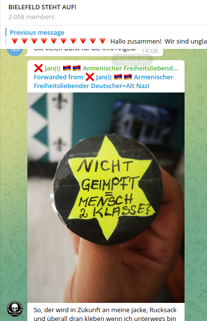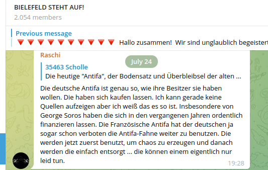 Immer wieder wird versucht, sich an der Verfassungsschutz-Kategorie „Rechtsextremismus“ abzuarbeiten. Wir lehnen diese Kategorie und den darin enthaltenen Extremismusbegriff mit den zugehörigen Rechts-Links-Gleichsetzungen ab. Aber weil die Frage immer wieder aufkommt, möchten wir die Chat-Gruppe und die Demos von „Bielefeld steht auf“ diesbezüglich zu bewerten. Natürlich sind die Veranstaltungen von „Bielefeld steht auf“ keine Neonazi-Aufmärsche. Aber sie sind Aufmärsche von Menschen, die sich tagtäglich in digitalen Echokammern voller menschenfeindlicher und antisemitischer Mythen befinden und sich diesen Mythen verbunden fühlen. Und in dieser Menschenfeindlichkeit eben auch Anschluss für Neonazis, AfDler und Reichsbürger bieten, und zwar ganz problemlos. Und das kann durchaus als rechts bezeichnet werden.