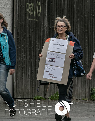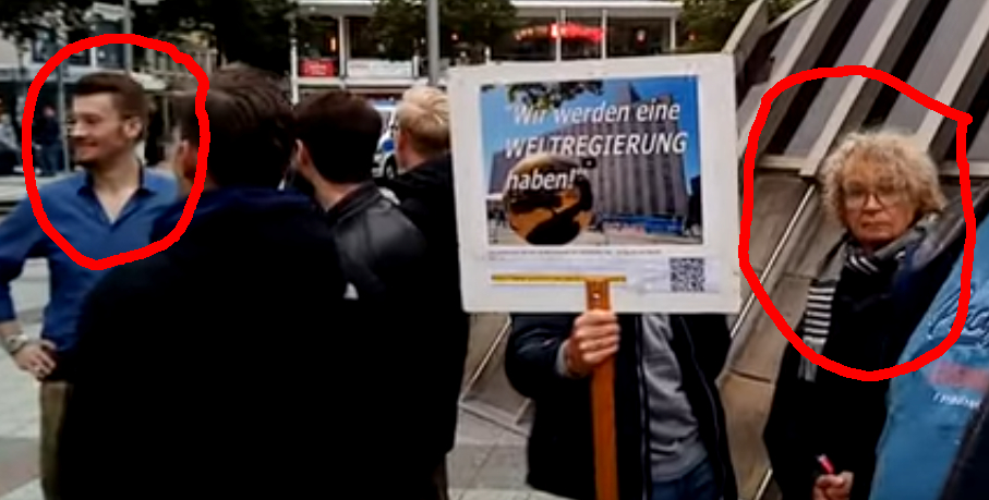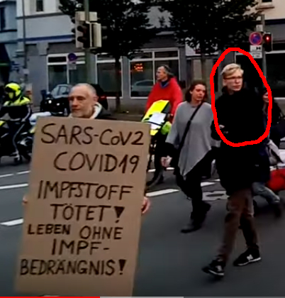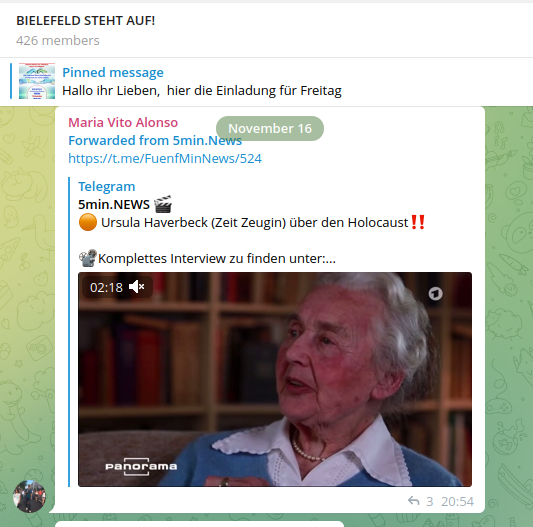 Auch in der Neonazi-Szene beliebte Mythen um den jüdischen Unternehmer George Soros werden in dem Chat geteilt. Soros stecke wahlweise mit den Rothschilds hinter der Pandemie oder aber finanziere „die Antifa“ (siehe Screenshot links). Die immer wiederkehrende systematische Relativierung der nationalsozialistischen Verbrechen und insbesondere der Shoa bei „Bielefeld steht auf“ haben wir schon wiederholt, sowohl in unserer ersten Stellungnahme als auch auf twitter, kritisiert und diese inhaltlich eingeordnet. Durch die systematische NS-Relativierung wird die historische Erfahrung derjenigen, die in NS-Deutschland verfolgt und ermordet wurden, unsichtbar gemacht. Diese Form von Geschichtsrevisionismus ist in der Szene der Holocaustleugner*innen schon seit den 1950er Jahren verbreitet und arbeitet dem Narrativ zu, die Shoa sei eine jüdische Erfindung, um die Deutschen zu unterdrücken. Ein Video der wohl bekanntesten Holocaustleugnerin Deutschlands Ursula Haverbeck wurde Mitte November bei „Bielefeld steht auf“ geteilt, kein einziger der Chatteilnehmer*innen störte sich daran, bis wir auf twitter öffentlich darauf hinwiesen. Im Anschluss gab es eine kurze Diskussion zwischen einer Chatteilnehmerin, die Haverbeck kritisierte und dem Chatteilnehmer Ingo, der Haverbeck vehement verteidigte. Ingo nahm im November 2019 an der neonazistischen Haverbeck-Demo in Bielefeld teil. Er ist nicht der einzige Haverbeck-Unterstützer, der an den Demos von „Bielefeld steht auf“ teilnimmt. Auch auf die Teilnahme der Neonazistin Juliane Sprunk haben wir bereits in unserer ersten Stellungnahme hingewiesen. Eine weitere, namentlich nicht bekannte Teilnehmerin und Unterstützerin Haverbecks nahm wiederholt an den „Bielefeld steht auf“ Demos teil, zum Beispiel am 24.09.2021 (siehe Fotos unten).
