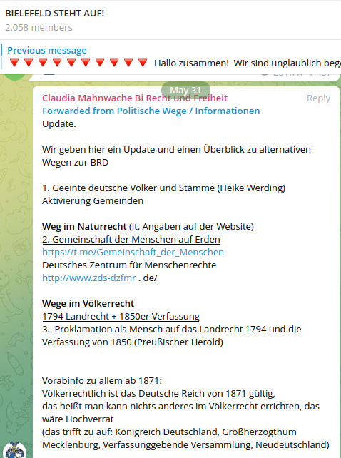 Es wird Werbung für zum Teil verbotene Reichsbürger-Organisation-en gemacht wie z.B. die seit März 2020 verbotene Vereinigung „Geeinte deutsche Völker und Stämme“ (siehe Screenshot links) und reichsbürgerliche Positionen werden vertreten. Immer wieder werden neben klimaleugnerischen auch homo- und transphobe Inhalte geteilt (siehe Screenshot rechts).