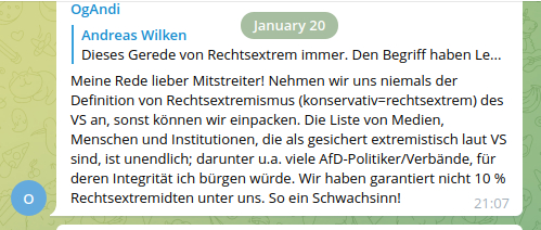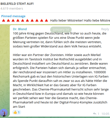 Weit mehr 90% der übrigen Inhalte, Links und Texte werden weiterhin akzeptiert. Es wird weiter von „Globalisten“ und „Zionisten“ gesprochen und geschichtsrevisionistische Mythen akzeptiert. So bspw. schreibt Mitglied Dr. Blond am 14.01.: „Hitler war ein Partner der Zionisten. Hitler sowie auch Merkel wurden im Tavistock Institut bei Rothschild ausgebildet und in Deutschland installiert um Deutschland zu zerstören“ (siehe Screenshot). Es wird von linker Umerziehung im Schulsystem gesprochen, homophobe Meinungen geteilt und Partei für bekennende Neofaschisten wie Martin Sellner ergriffen. Die Mitglieder wünschen keine Abgrenzung nach rechts, sie teilen selbst in der Mehrheit rechte Inhalte.
