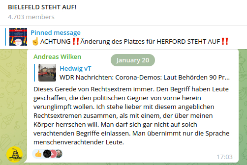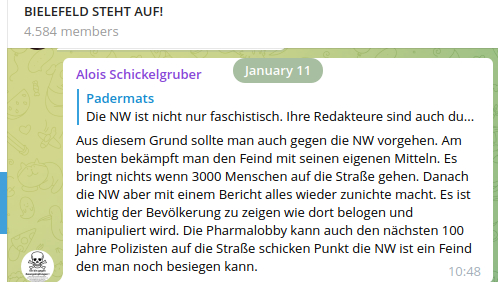 Nach der unangemeldeten Demo vom 07.01.22 wurde in der „Bielefeld steht auf“-Gruppe massiv gegen die lokalen Medien und Journalist*innen gehetzt. Presse und Medien sind innerhalb der ideologisch heterogenen Pandemie-leugnerischen Szene ein übergreifendes Feindbild.