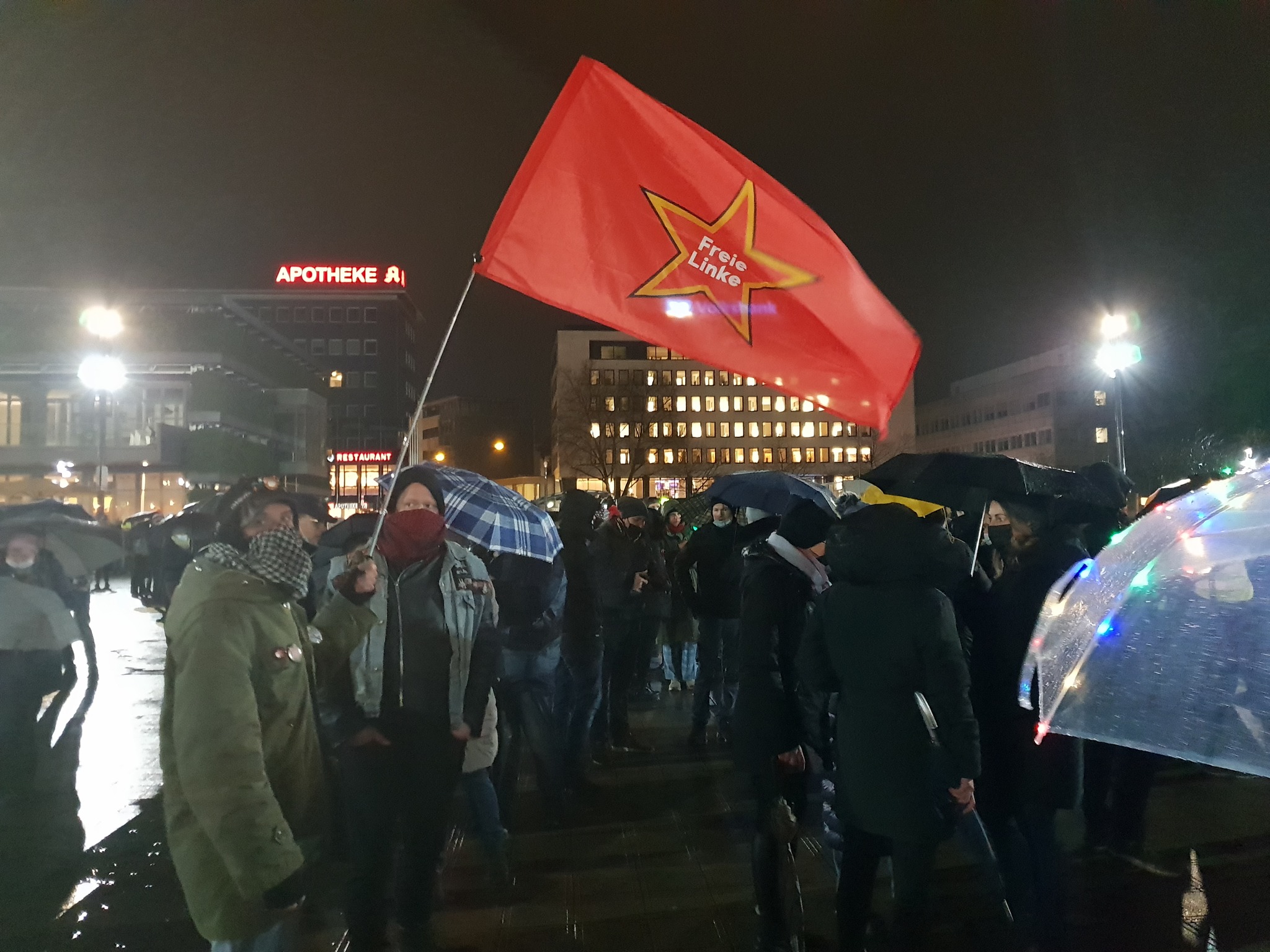 Wir haben in der Vergangenheit mehrfach und ausführlich die ideologische Verortung der Gruppe „Bielefeld steht auf“ dargelegt. An dieser hat sich nichts geändert. Das Personenspektrum, dass die Demos von „Bielefeld steht auf“ besucht, bewegt sich in digitalen geschlossenen Echokammern, in denen antisemitische Verschwörungsmythen und wissenschaftsfeindliche Fake News dominieren. Die AfD wird als einzig wählbare Partei gehandelt, wenn Wählen nicht ohnehin als systemstützend abgelehnt wird. Kritik an Nationalismus, Rassismus oder Antifeminismus sind weder in Bezug auf die AfD noch allgemein zu finden. Es werden Sympathien für autoritäre und diktatorische Staatssysteme wie Belarus geäußert und die Hoffnungen auf nationalistische Herrscher wie Trump oder Putin gesetzt. Nichts davon ist freiheitlich oder emanzipatorisch. In dem Dunstkreis dieses Spektrums bewegt sich eine Splittergruppe, die sich „Freie Linke“ nennt. Seit Dezember sind Mitglieder der „Freien Linken“ auch in OWL auf den Demos aktiv und zeigen sich mit der Fahne der Gruppe. Doch bei genauerem Hinschauen zeigt sich schnell: die „Freie Linke“ ist alles andere als links. Sie ist eine Querfront-Gruppe mit hierarchischer Führung, bei der der Schulterschluss mit AfDlern und Neonazis keine Einzelfälle, sondern die Regel sind!