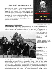 Am Freitag, den 07. Mai 2022, fand ein konspirativ organisiertes RechtsRock-Konzert (Unplugged) mit der Dortmunder Band Oidoxie in Porta Westfalica (Kreis Minden-Lübbecke) statt. Organisiert wurde das Konzert von der Gruppe Mindener Jungs. Rund 100 Neonazis aus dem gesamten Bundesgebiet nahmen an dem Konzert teil. Obwohl die Polizei über das Konzert informiert war und auch Beamt*innen des Bielefelder Staatsschutz vor Ort waren, konnten die Neonazis ihr Konzert ungestört und von der Polizei unbehelligt durchführen.