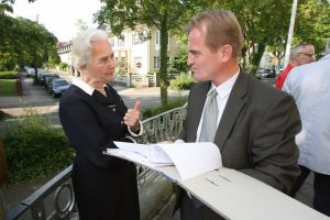 Ursula Haverbeck war immer schon eine eigenständige Akteurin und Ideologin, die nicht nur im Schatten ihres Mannes agierte. Über 45 Jahre konnte Haverbeck über die Strukturen des CH Kontakte knüpfen, Netzwerke aufbauen und neue rechte Strukturen schaffen. Sie übernahm 1983 das Präsidentschaftsamt für den Weltbund zum Schutz des Lebens, welches sie bis 1989 inne hatte. 1992 war sie dann an der Gründung es des bis heute aktiven und als gemeinnützig anerkannten Vereins Gedächtnisstätte e.V. beteiligt. Bis zu der medienwirksamen Kampagne des VRBHV Ende 2003 war Haverbeck Vorsitzende des Vereins. Die Abgabe dieses Amtes an Klaus Wolfram Schiedewitz dürfte taktisch begründet gewesen sein, um den Verein vor einem Verbot angesichts der systematischen öffentlichen Holocaustleugung Haverbecks zu schützen. Mit Erfolg: der Verein kann ideologische Folgeorganisation des CH verstanden werden und veranstaltet bis heute ganzjährig Schulungswochenenden, bei denen die Prominenz der Revisionismus- Szene als Redner*innen auftrittvii. Über 45 Jahre konnte Haverbeck über die Strukturen des CH Kontakte knüpfen, Netzwerke aufbauen und neue rechte Strukturen schaffen. 2003 folgte dann, in revisionistisch- zynischer Manier am 09.11. (dem Jahrestag der Reichspogromnacht), die Gründung des VRBHV. Haverbeck weiß sich zu inszenieren und wählt sehr bewusst den großen Auftritt. Überlebende der Shoah bezeichnet Haverbeck als Lügner*innen und Falschdarsteller*innen und lässt keine Gelegenheit aus, um die Existenz von nationalsozialistischen Vernichtungslagern zu dementieren. Zeitzeug*innen sind für Haverbeck nichts als unglaubwürdig. Nach dem Besuch des Prozesses gegen den SS- Wachmann Oskar Gröning 2015, der als Täter ein Geständnis und wichtiges Zeitzeugnis bezüglich der systematischen Ermordung von jüdischen Menschen in Auschwitz ablegte, bezeichnete sie ihn und insbesondere Überlebende der Shoah einem ARD- Fernsehteam gegenüber erneut als Lügner*innenviii. Im gleichen Jahr gab sie dann dem ARD- Format panorama ein 45- minütiges Interview, in dem sie den Holocaust „als die nachhaltigste Lüge der Geschichte“ bezeichneteix. Auch bei dem Auschwitz- Prozess 2016 in Detmold trat Haverbeck auf, im Vorfeld mobilisierte sie für die Störung des Prozessesx.