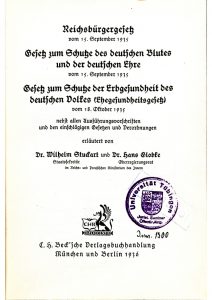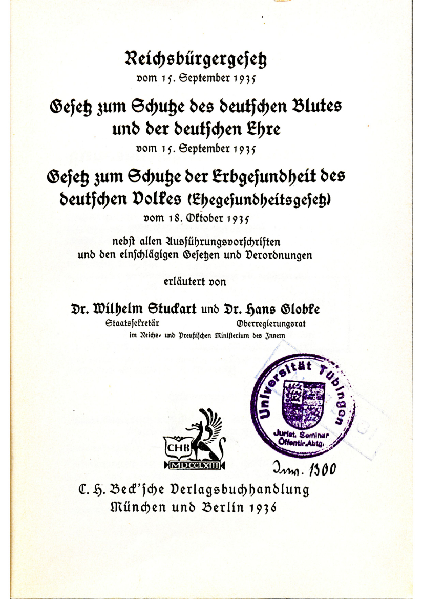 1935 feierte Schmitt die Nürnberger Gesetze als „Verfassung der Freiheit“ und insbesondere das Gesetz zum Schutze des deutschen Blutes und der deutschen Ehre als „vom Gedanken der Rasse getragene Gesetzgebung“. 1936 rief Schmitt zur „Säuberung der Bibliotheken“ von Werken jüdischer Autoren auf. Er organisierte eine Tagung zu dem Thema Das Judentum in der Rechtswissenschaft. „Er proklamierte damals: >Ein jüdischer Autor ist für uns, wenn er überhaupt zitiert wird, ein ‚jüdischer Autor‘<, zitieren dürften ihn Wissenschaftler >nur soweit dies zur Vermeidung eines Plagiats notwendig ist<; schon >von der bloßen Nennung des Wortes ‚jüdisch‘ wird ein heilsamer Exorzismus ausgehen<“xxx.