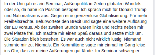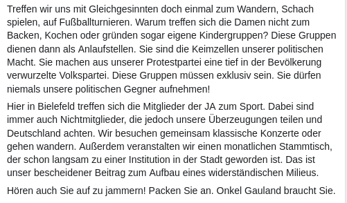 In seiner Freizeit trifft er sich mit Gleichgesinnten zum Sport oder besucht „klassische Konzerte“, außerdem wird ein monatlicher Stammtisch der JA Bielefeld abgehalten – „zum Aufbau eines widerständischen Milieus“. Jonas wünscht sich „exklusive Gruppen“ wie z.B. nationale Krabbelgruppen als „Keimzellen unserer politischen Macht“. Nationale Krabbelgruppen haben auch Funktionäre der NPD und der Kleinstpartei Der Dritte Weg. In der Textstelle offenbart sich auch Vriesens stereotypes Rollenbild. Mit „wir“, also seiner anvisierten Leserschaft meint er weiße Cis-Männer, die sich zu männlichen Betätigungen wie Schach oder Fußball treffen sollen. Die „Damen“ mögen sich zum „Backen, Kochen“ oder für „Kinderspielgruppen“ treffen. Diese heteronormative Rollenkonzeption ist typisch für das nationalkonservative Milieu, in dem Vriesen sich engagiert – und es ist zutiefst sexistisch!