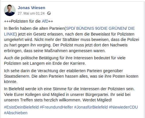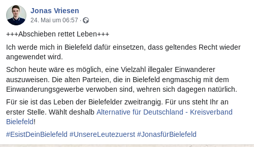 Einer der häufigsten Hashtags von Vriesen ist sicherlich #Abschieben. Das ist ein Herzensthema für ihn. In diesem Kontext spricht er von „Fremden“, anderen „Völkern“ in der BRD und „ethnischer Differenzierung“. Er offenbart ein völkisches, rassistisches Wertekonstrukt, welches er durch sein Engagement bei der AfD Bielefeld vorantreiben will. Angesichts der Proteste gegen rassistische Polizeigewalt in den USA und solidarischen Protesten weltweit faselt Vriesen von einer „Hierarchie der Opfer“ und sieht weiße Gewaltopfer medial nicht dargestellt in den etablierten Medien. „Umweltschutz ist Heimatschutz“ ist Vriesens Devise und schließt sich damit der neonazistischen Rethorik von NPD, Die Rechte und Der Dritte Weg an.