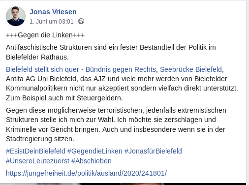 Das ist Jonas Vriesen von der AfD Bielefeld. Jonas ist ein Nationalist und Rassist – seid nicht wie Jonas!