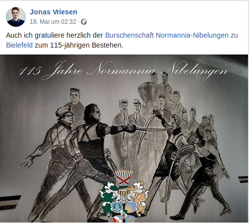 Jonas Vriesen mag den mehrfach wegen Volksverhetzung verurteilten Autor Akif Pirinçci. So besuchte er gemeinsam mit Maximilian Kneller die Lesung Pirinçcis am 08.03.20 in Detmold. Die Lesung wurde von der JA Detmold organisiert. Dort las Pirinçci aus seinem neuen Buch „Das sterbende Volk“. Außerdem mag Jonas die nationalistische Bielefelder Burschenschaft Normannia Niebelungen und gratulierte dieser zu ihrem 115. Jubiläum. Die rechte Burschenschaft ist ein Knotenpunkt für Neue Rechte, Neonazis und die AfD.