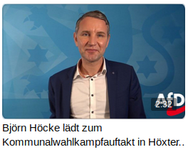 Höcke produzierte für seinen geplanten Auftritt in Höxter ein eigenes Werbevideo. Verantwortlich für die Organisation war der 20-jährige Höcke-Fan Elia Sievers, der sich regelmäßig auch mit Maximilian Kneller und Jonas Vriesen aus Bielefeld trifft. Des weiteren werden gute Kontakte zu MdL Thomas Röckemann aus Minden und MdB Udo Hemmelgarn aus Harsewinkel gepflegt. Röckemann gilt als ideologischer Hardliner, als Rechtsanwalt verteidigte er 2013 den Neonazi Marco Franke aus Petershagen nach einem gewaltsamen Angriff auf eine linke Kneipe in Minden8. Hemmelgarn gilt als Reichsbürger-nah, er war 2015 Initiator des sogenannten Alternativen Wissenskongresses und bis 2017 im Vorstand des Vereins zur Förderung des politischen Dialogs. Die Alternativen Wissenskongresse werden als Reichsbürger-affin eingeschätzt9. Sowohl